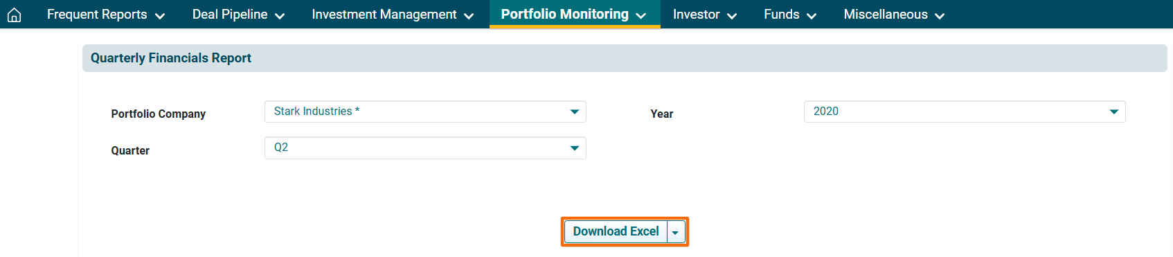 2. You can access the report from the dashboard by clicking Quarterly Financials Report in the Portfolio Monitoring panel or from the Portfolio Monitoring drop-down menu in the blue vertical bar.