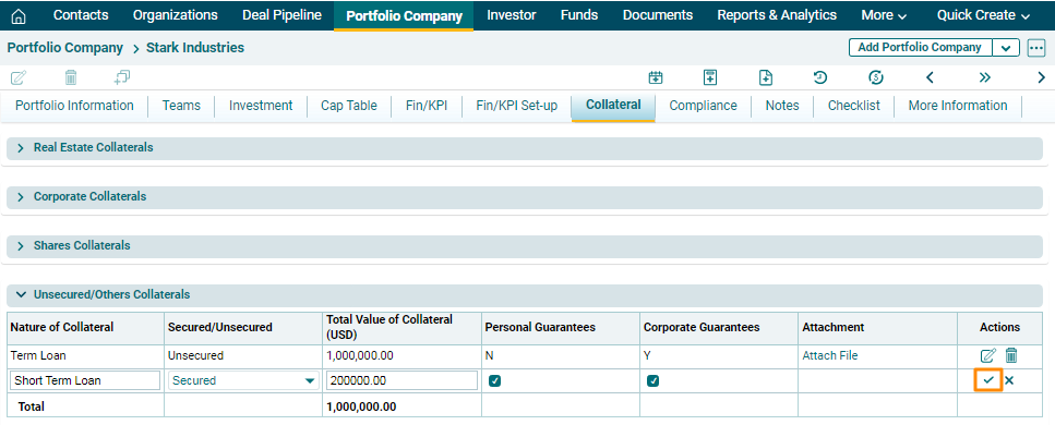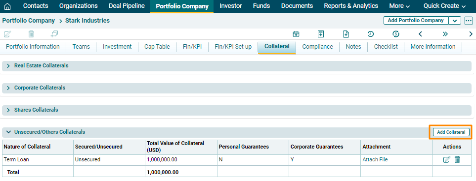 Unsecured/Others Collaterals panel allows you to track all unsecured or other collaterals associated with the portfolio company. The details included are: