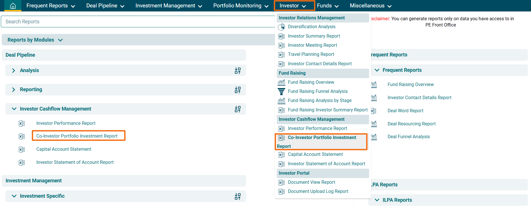 2. You can access the report from the dashboard by clicking Co-Investors Portfolio Investment Report in the Investor panel or from the Investor drop-down menu in the blue vertical bar.