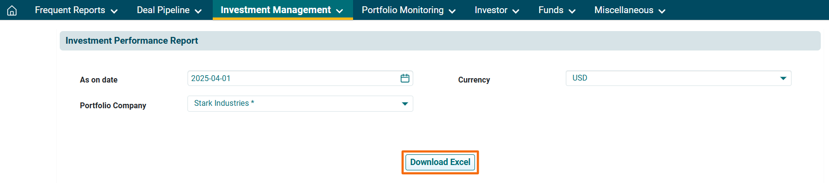 3. The Investment Performance Report window is displayed. Specify the date until which you wish to download the report. Choose the portfolio company from the drop down list. Choose Currency. Click on Download Excel button. The excel file will download.