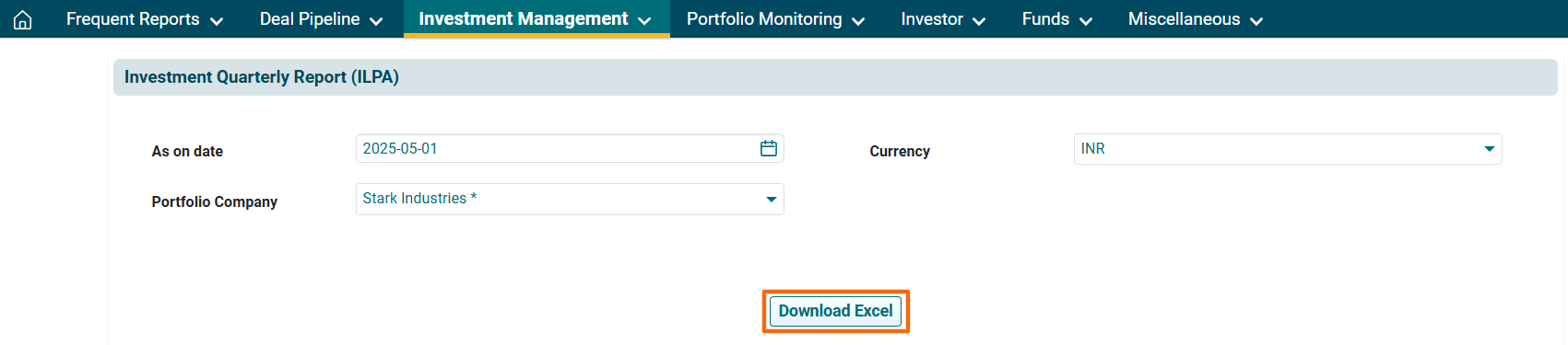 3. The Investment Quarterly Report (ILPA) window is displayed. Specify the date until which you wish to download the report. Choose the portfolio company from the drop down list. Choose Currency. Click on Download Excel button. The excel file will download.