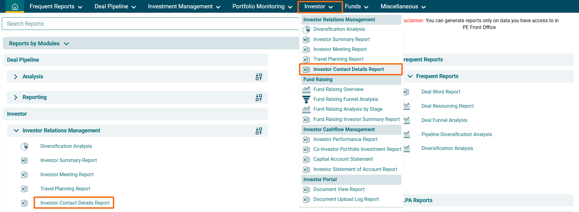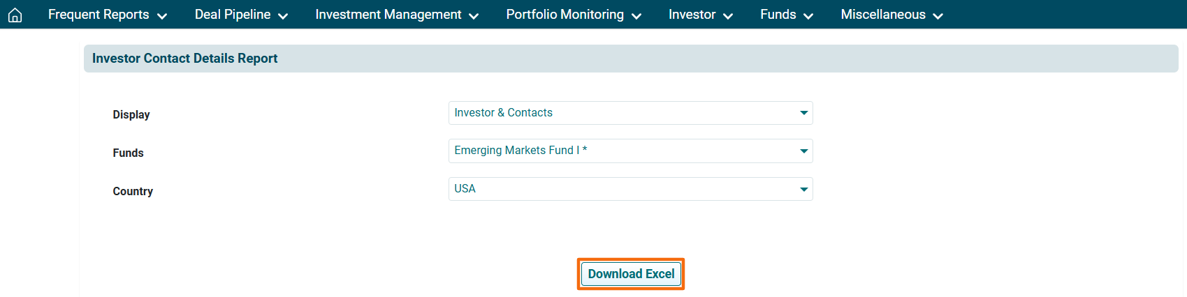 - Display: Allows you to view reports for investor or investor & contacts.