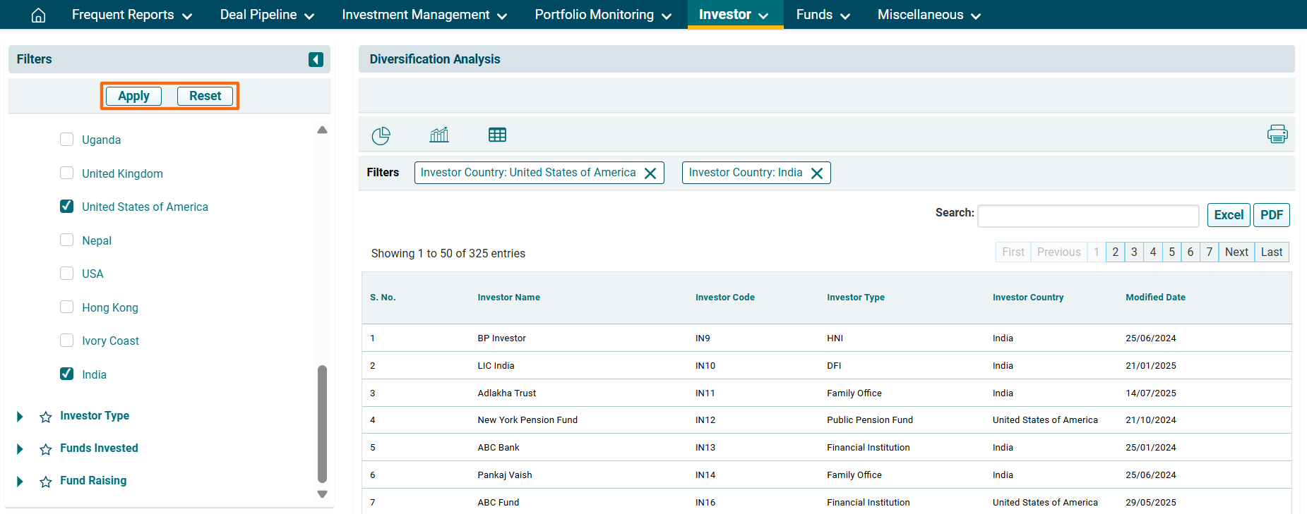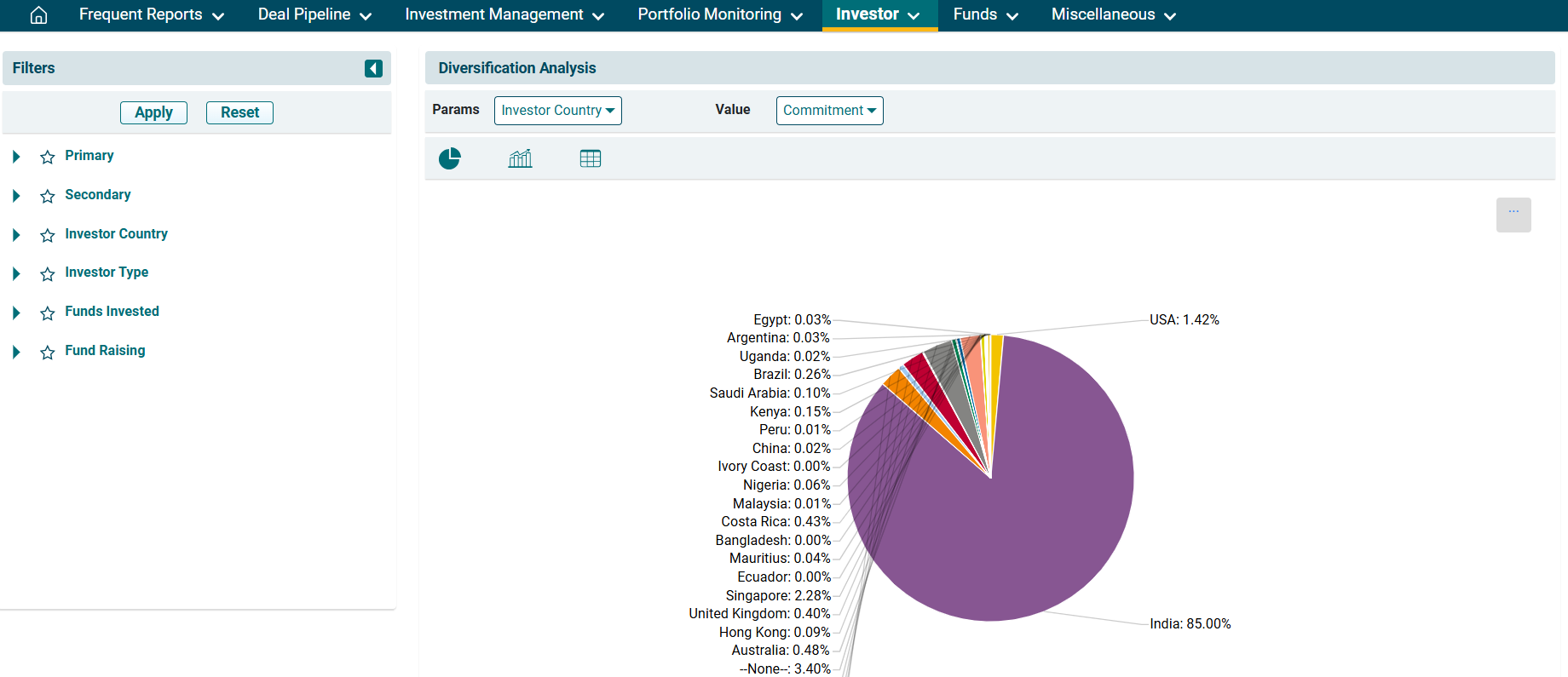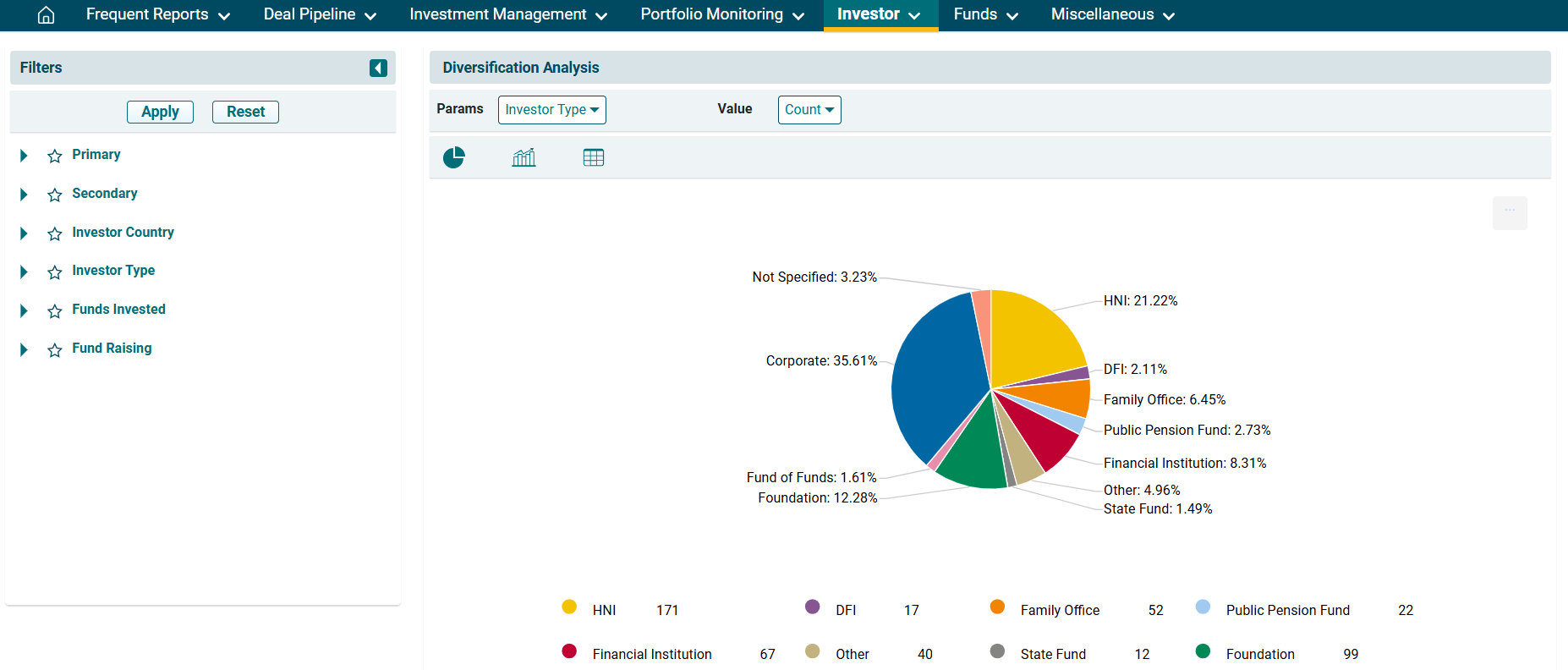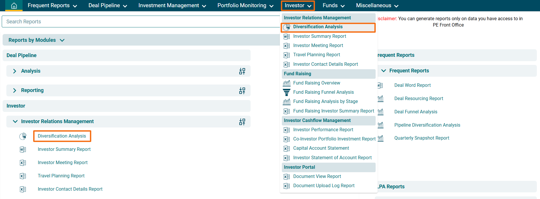 2. You can access the report from the dashboard by clicking Diversification Analysis in the Investor panel or from the Investor drop-down menu in the blue vertical bar.