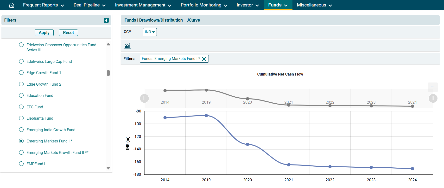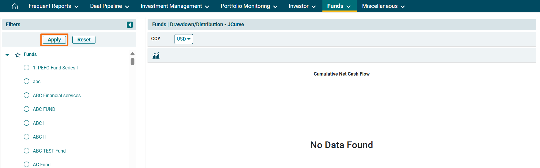 3. The JCurve Analysis (Drawdown/ Distribution) window is displayed. Using the filters on the left-hand side, select the Fund. Click Apply.