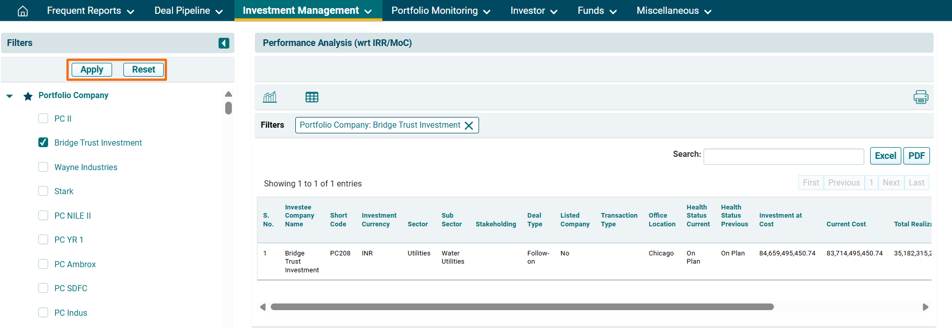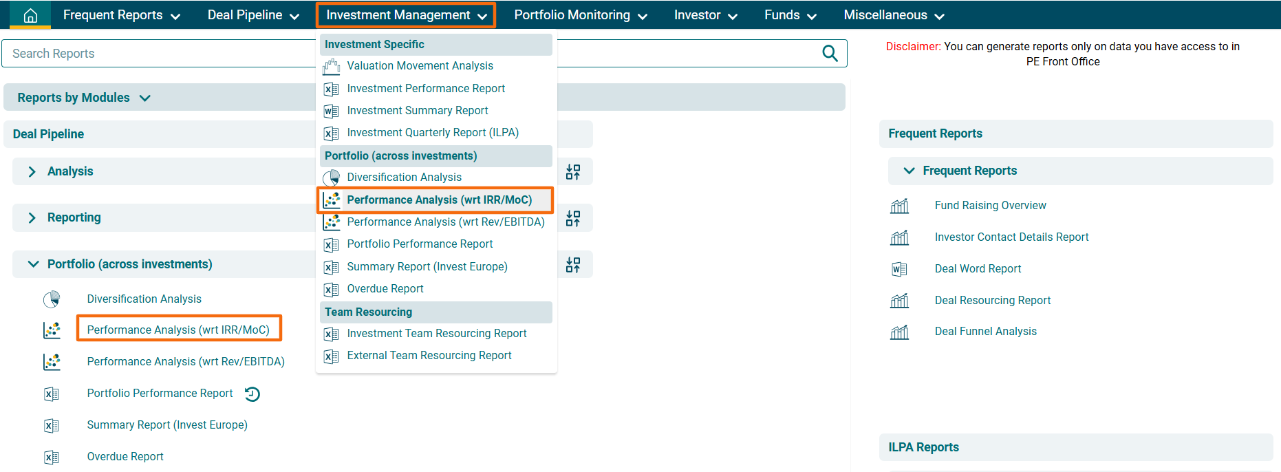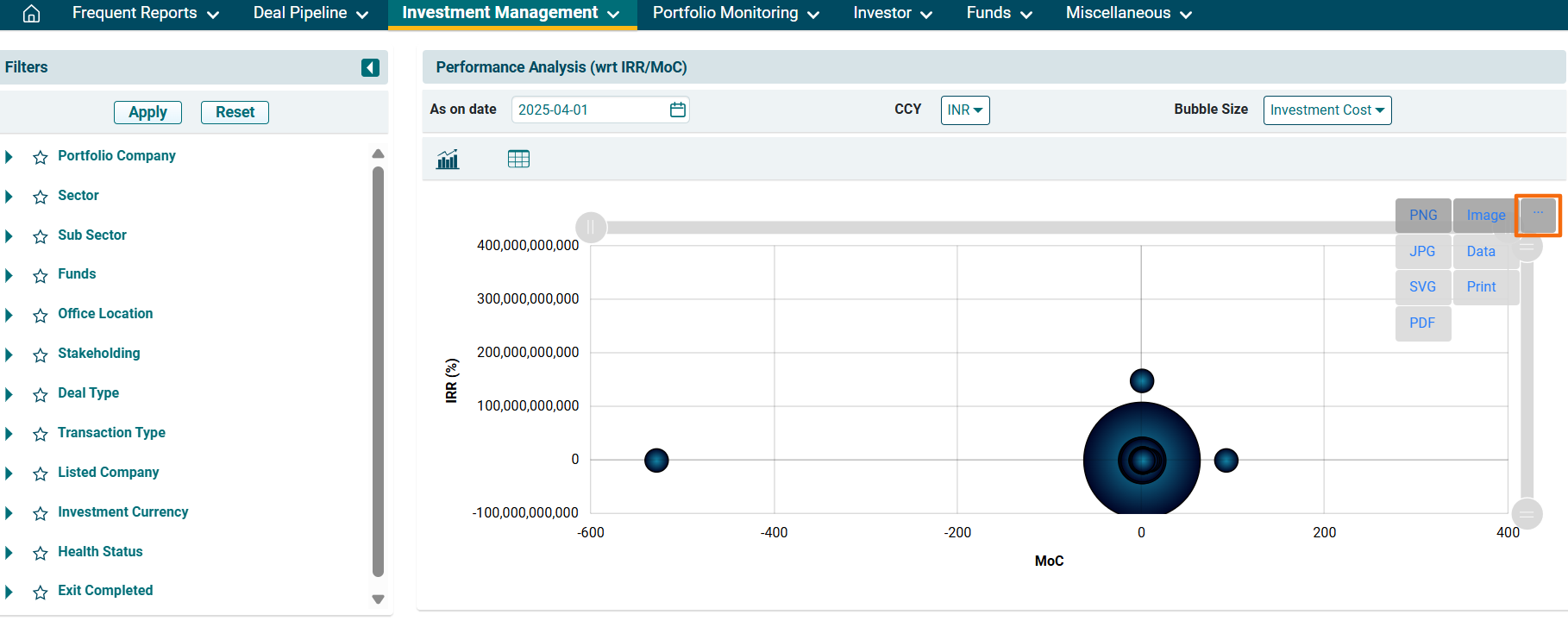 2. A new window is displayed. You can access the report from the dashboard by clicking Performance Analysis (wrt IRR/MoC) in the Investment Management panel or from the Investment Management drop-down menu in the blue vertical bar.