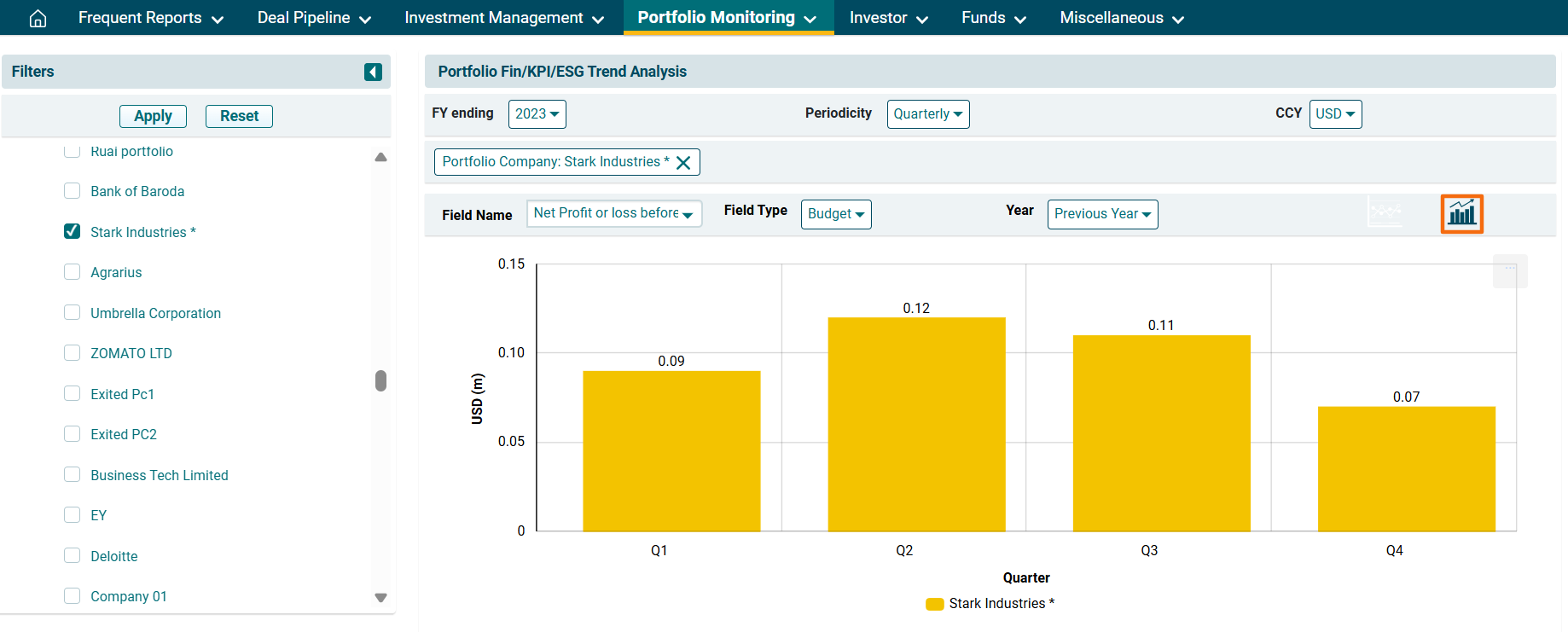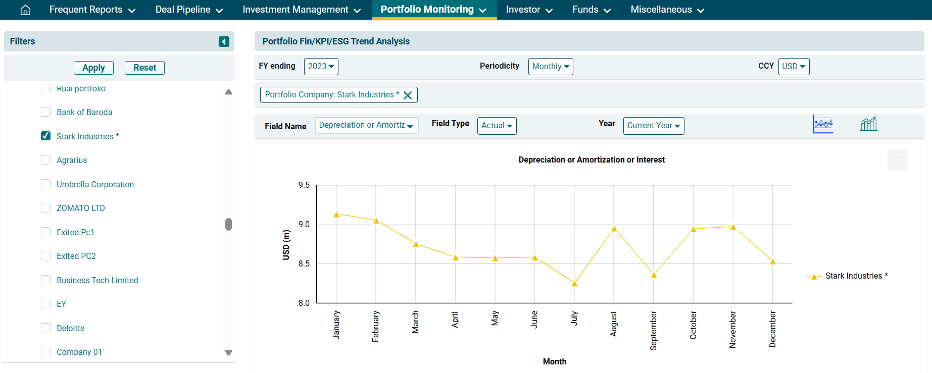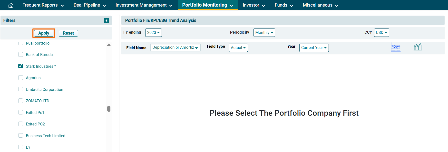 3. The Portfolio Fin/KPI/ESG Trend Analysis window is displayed. Using the filters on the left-hand side, select the Portfolio Company. Click Apply.
