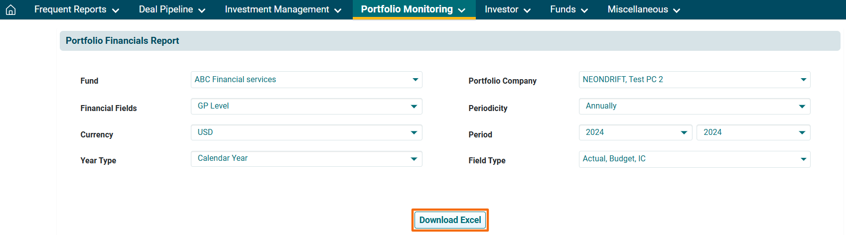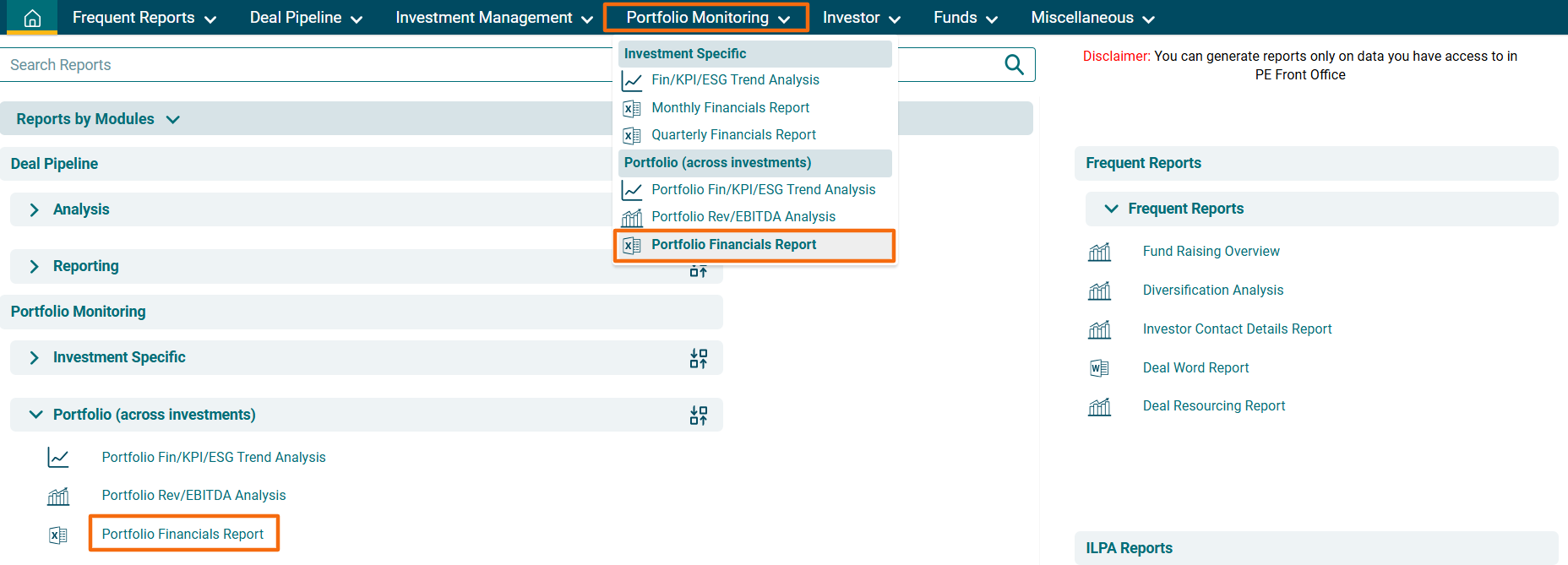 2. You can access the report from the dashboard by clicking Portfolio Financials Report in the Portfolio Monitoring panel or from the Portfolio Monitoring drop-down menu in the blue vertical bar.