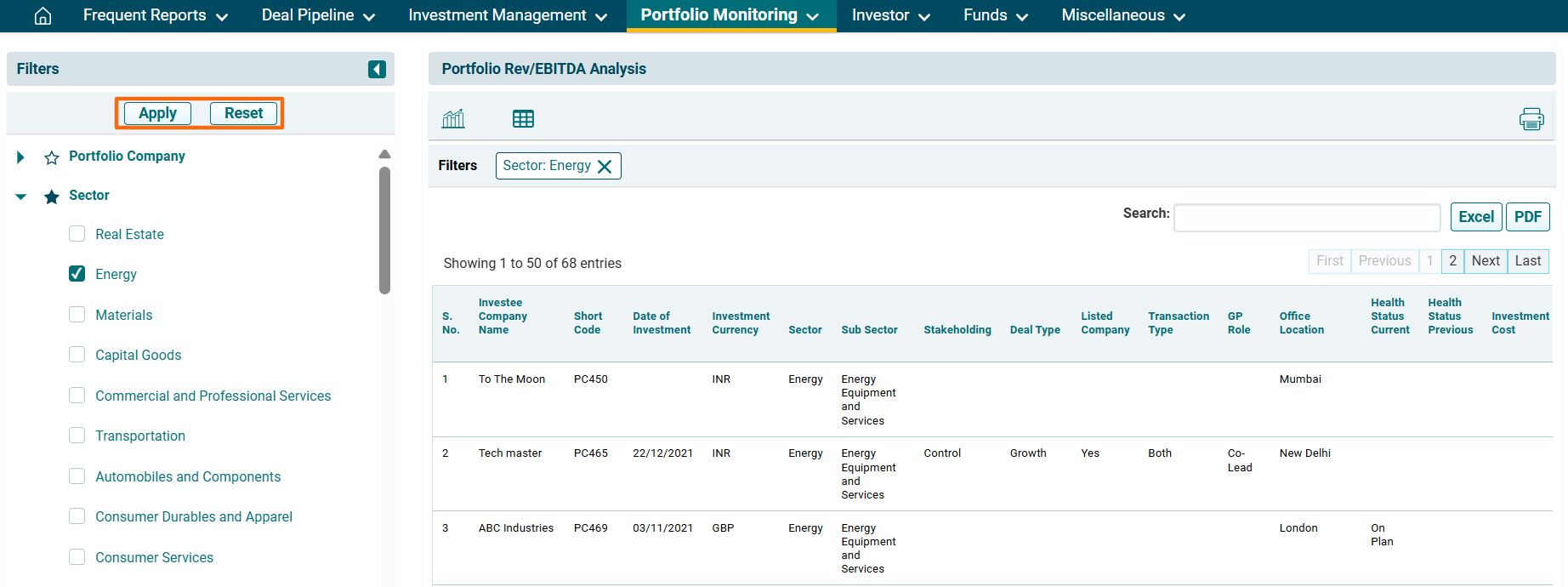 2. You can access the report from the dashboard by clicking Portfolio Rev/EBIDTA Analysis in the Portfolio Monitoring panel or from the Portfolio Monitoring drop-down menu in the blue vertical bar.