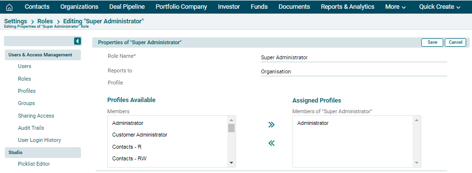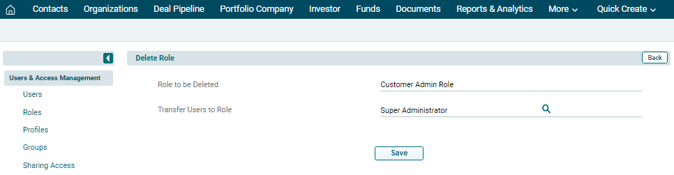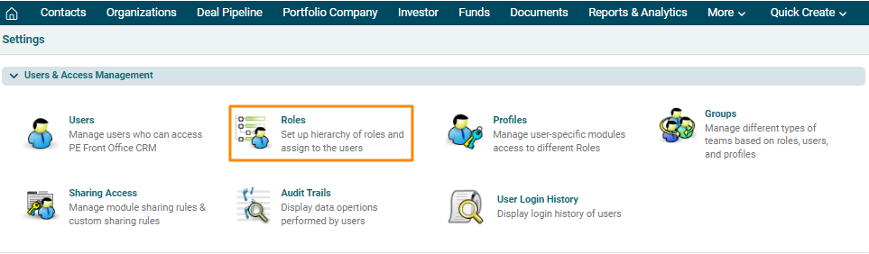 This feature enables you to create new roles for your users to mimic your organization-wide hierarchy in PE Front Office. Roles like CEO and Sales Manager are provided by default along with PE Front Office package. You can now define access privileges while you create a role. The idea is to reduce clicks and navigation. Having privileges defined on a role eliminates the necessity to create a different profile and associate it to a role. Additionally, you need not have to visit individual profiles to view or modify privileges you've defined earlier.