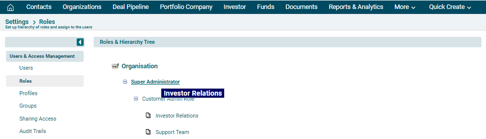 Roles & Hierarchy Tree is displayed. Navigate to Organization or Role and