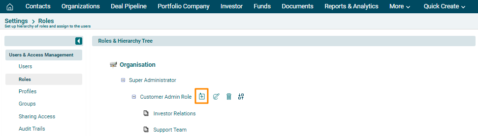 3. The Roles & Hierarchy Tree is displayed. Navigate to Organization or Role and click on Add icon.