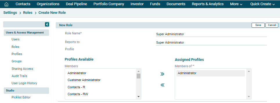 4. The New Role window is displayed. Specify the Role name, reporting details and assign a profile. Click Save.