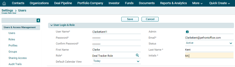 4. The Create New User window is displayed. Update the details and click Save.